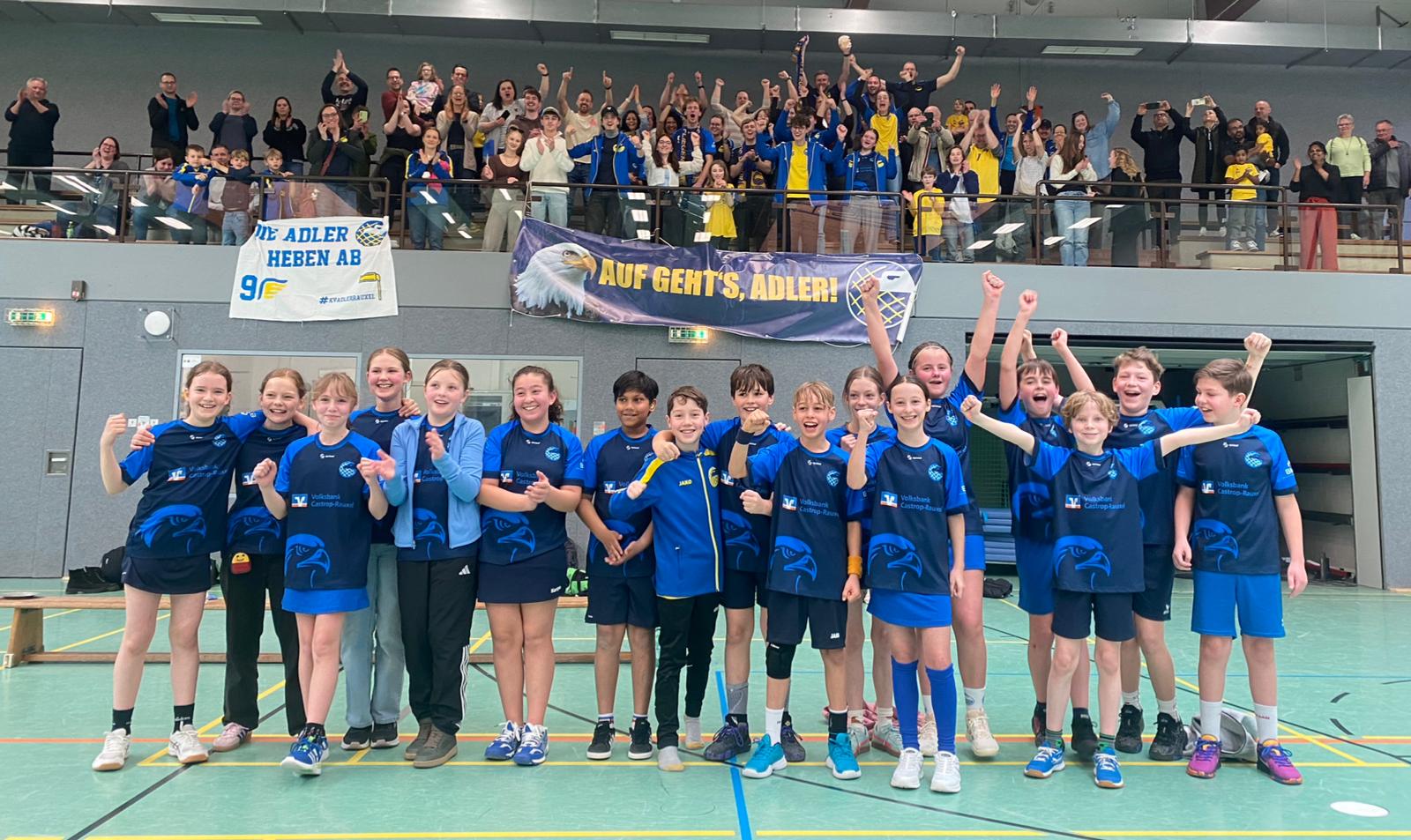 Am vergangenen Sonntag, dem 08.03.2026, hat unsere D-Jugend das Spitzenspiel gegen Grün-Weiß D1 souverän mit 8:1 gewonnen und steht verlustpunktfrei auf dem 1. Platz. Die Mannschaft wurde von zahlreichen Fans auf den Rängen der WBG-Halle unterstützt.